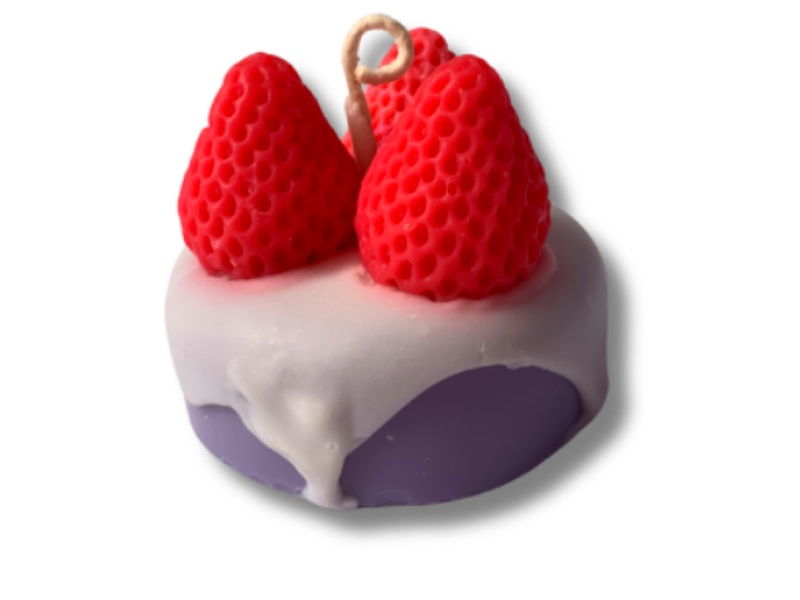 Vela en forma de cake color con fresas, elaboración artesanal con cera de soja.