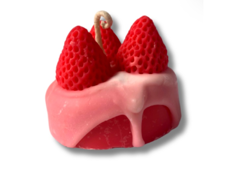 Vela en forma de cake con fresas, elaboración artesanal con cera de soja.