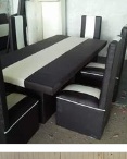 Conjunto de comedor de diseño sofisticado, compuesto por una mesa de madera, vidrio o mármol, acompañado de sillas acolchonadas con respaldos altos.