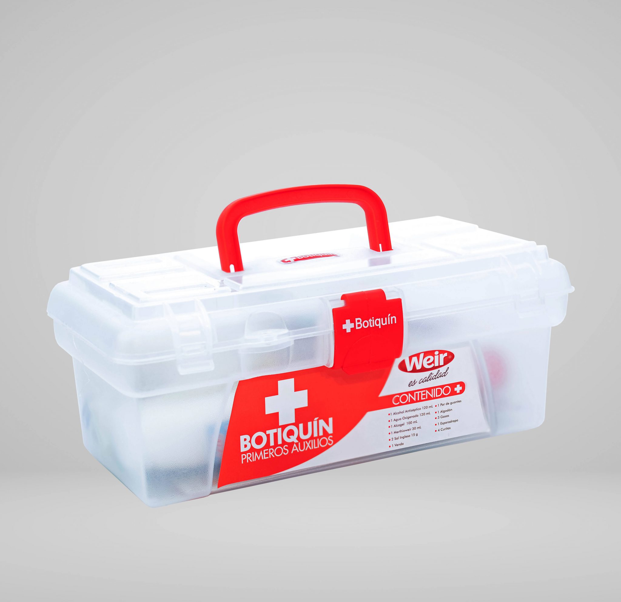 Botiquín de primeros auxilios en estuche plástico transparente, diseñado para uso doméstico, comercial e institucional. Ideal para cumplir con requerimientos básicos de seguridad en obras, oficinas, locales comerciales y vehículos.