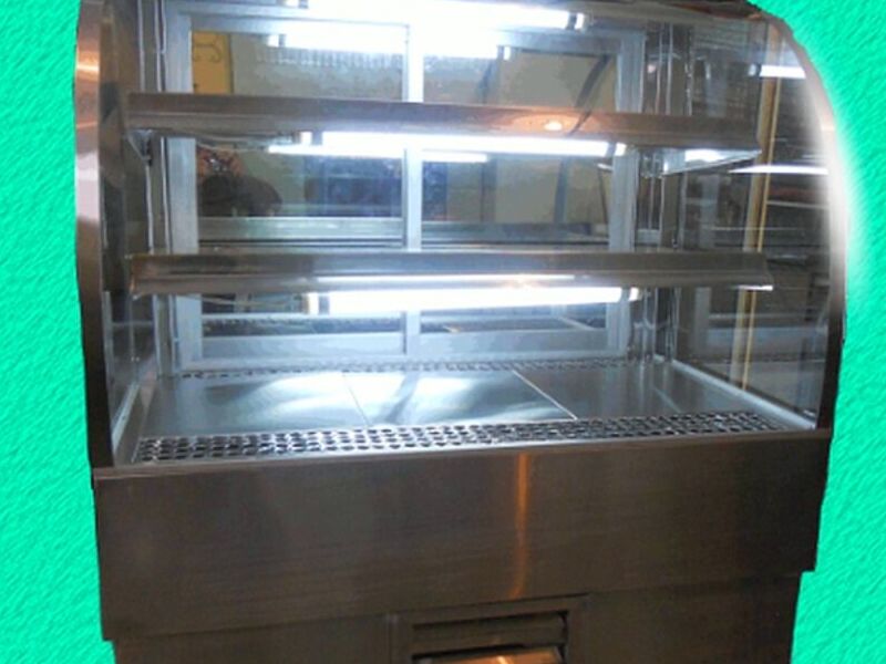 Pastelera de 80cm, Totalmente en acero, Vidrio curvo panorámico y Puertas corredizas (de aluminio)